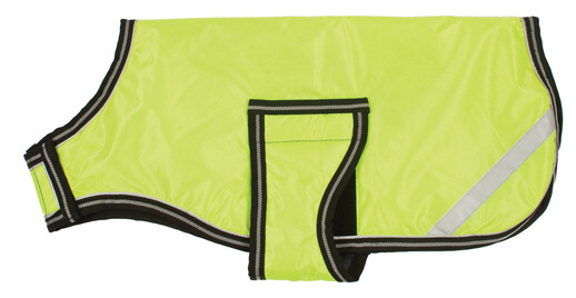 Robustes, wassserdichtes Außenmaterial mit Reflektorstreifen in einer gut sichtbaren Neonfarbe für mehr Sicherheit beim Spazierengehen.